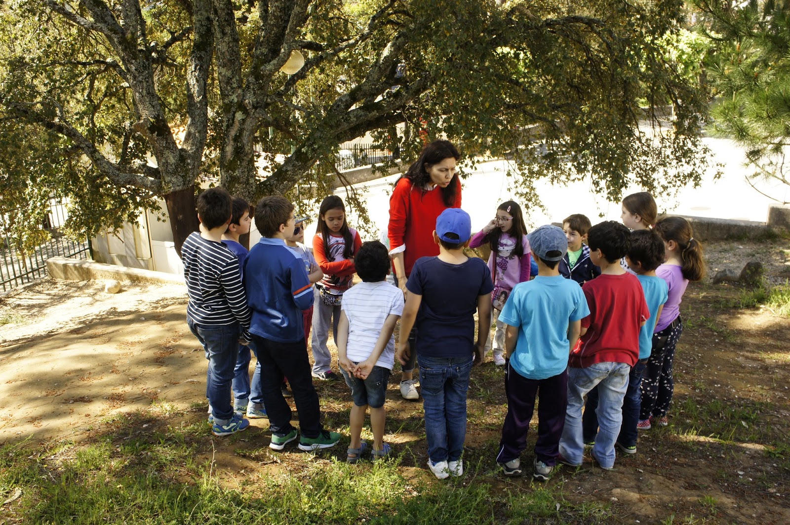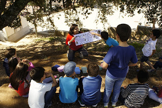 Desta vez tivemos atividades no exterior da sala de aula. Deslocamo-nos até um sobreiro (nome científico Quercus suber), existente no recreio da nossa escola, e realizamos diversas atividades, todas muito interessantes e divertidas. Começamos por dialogar acerca de árvores monumentais e sobre as partes constituintes das plantas (deu para fazer uma revisão porque demos esta matéria na disciplina de Estudo do Meio).